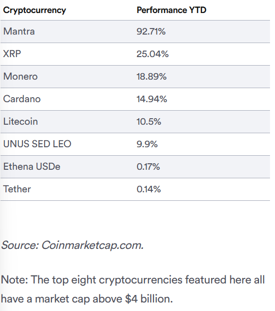 Here are the top eight best-performing cryptocurrencies year-to-date.
