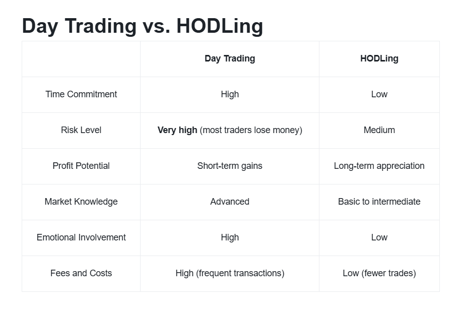 If you have the discipline and can dedicate time to analyzing the market, day trading might be a good fit. However, if you prefer a more relaxed, long-term strategy with less daily involvement, HODLing is likely the better choice.